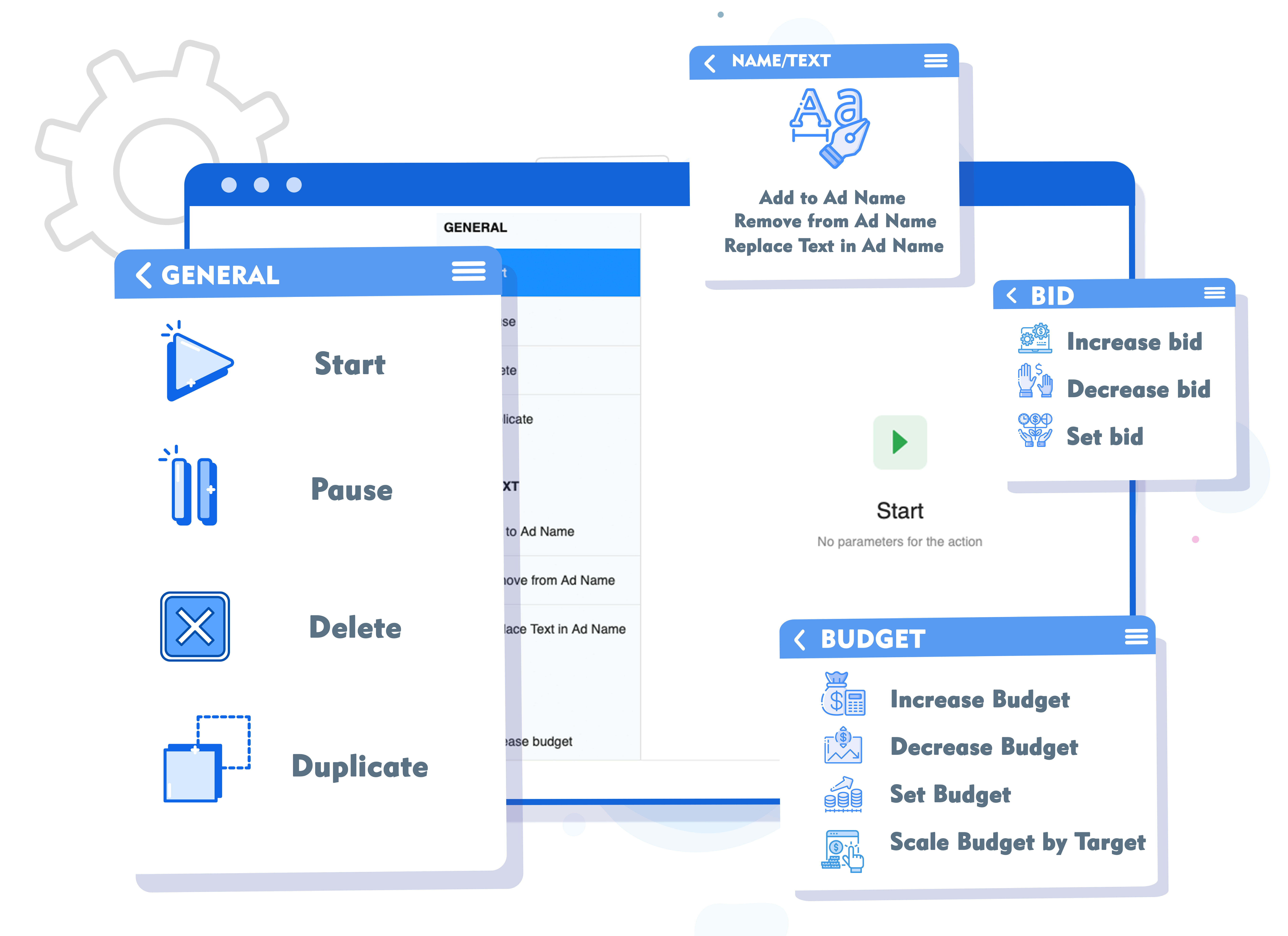 Auto Start, Pause, Duplicate, Rename, Delete, Increase-Decrease-Set Budget / Bid, Max-Min Spent, etc